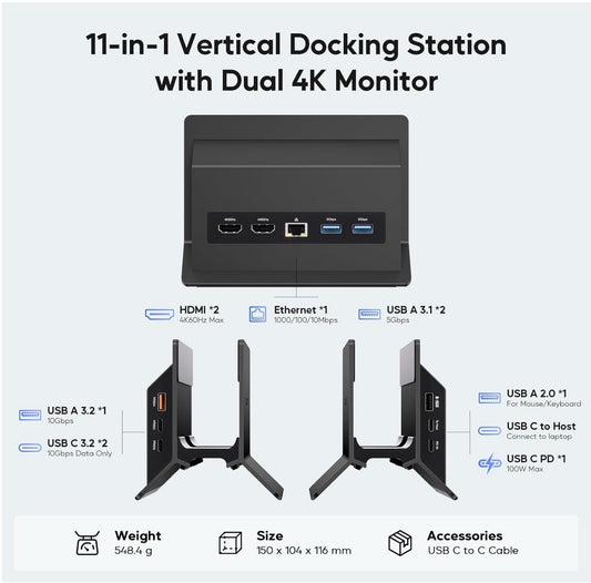 USB-C Docking Station Dual 4K@60Hz HDMI, 11in1, PD 100W, Ethernet