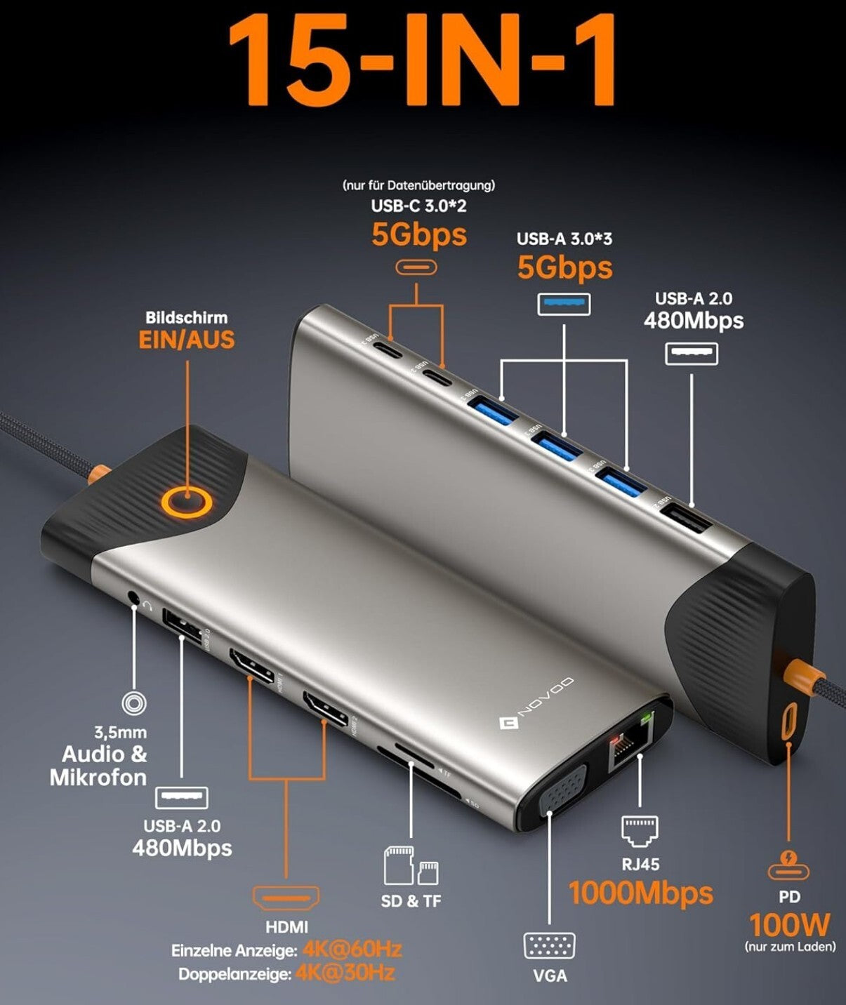 Diese 15-in-1 Docking Station bietet alles, was Sie für ein effizientes Setup brauchen: Dual 4K@60Hz HDMI für gestochen scharfe Displays, Gigabit Ethernet für stabiles Internet und 100W Power Delivery für schnelles Laden. Mit 5 Gbit/s Datenübertragung (USB 3.0) und SD/TF-Kartenleser ist sie ideal für Profis und Kreative.