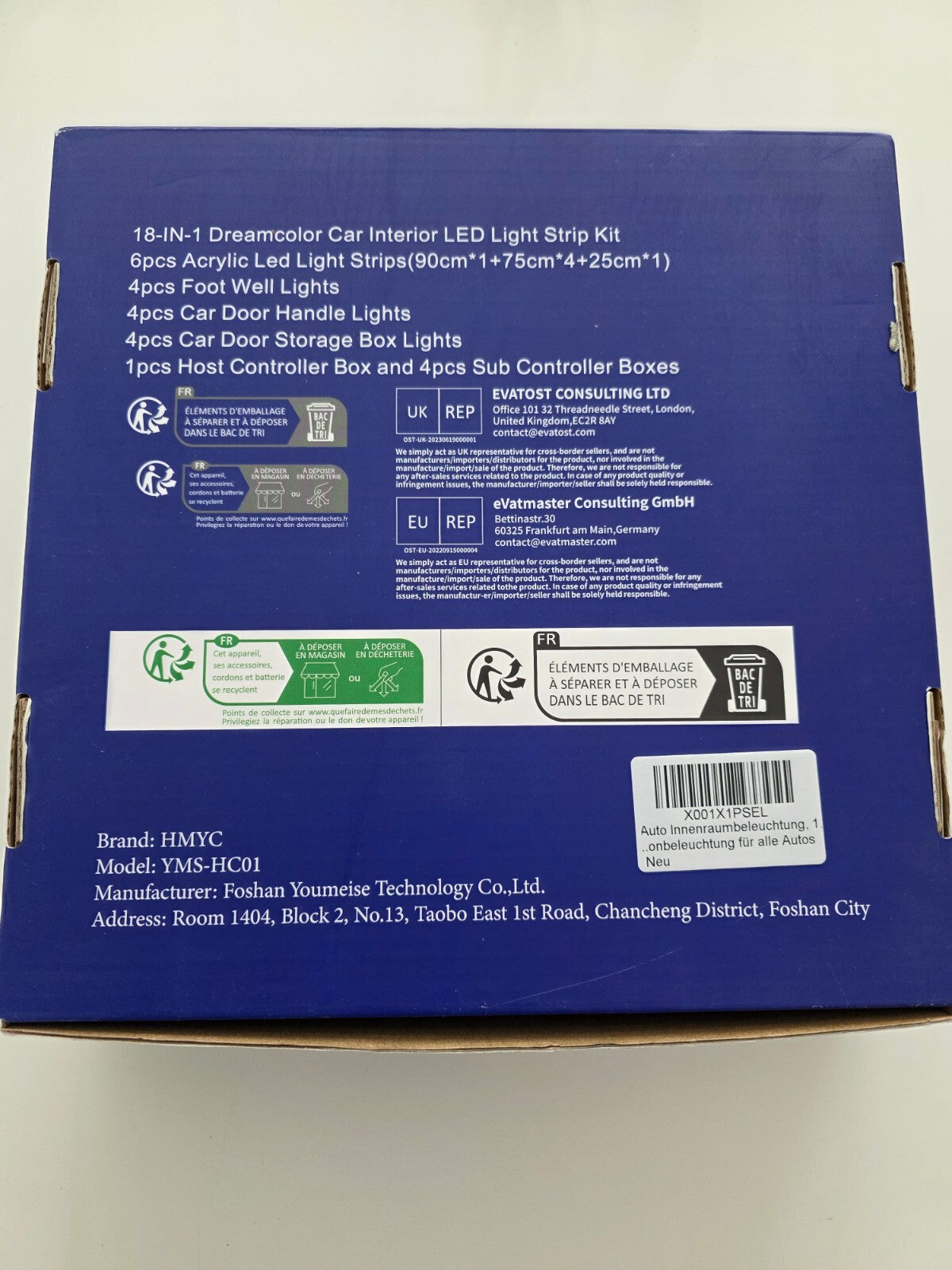 - Komponenten: 6 Streifen, 4 Speicherlichter, 4 Grifflichter, 4 Fußlichter