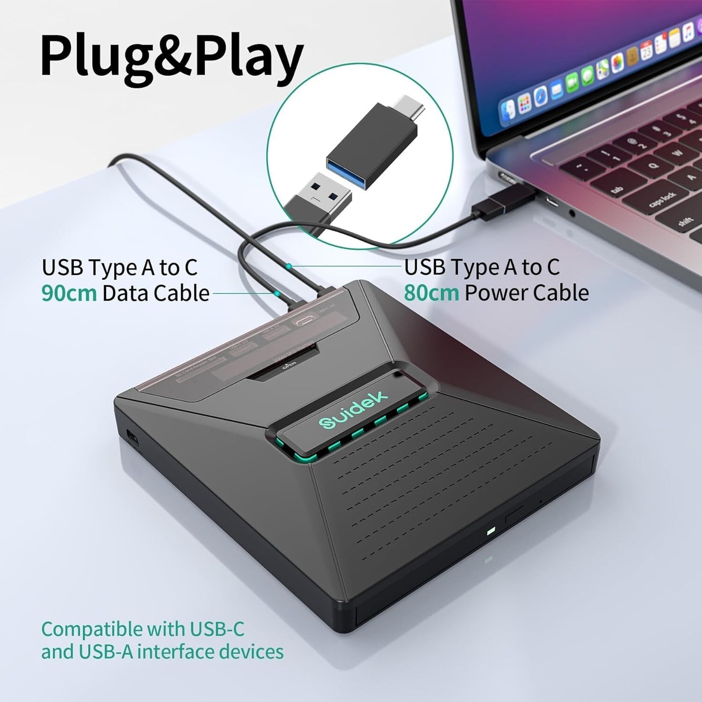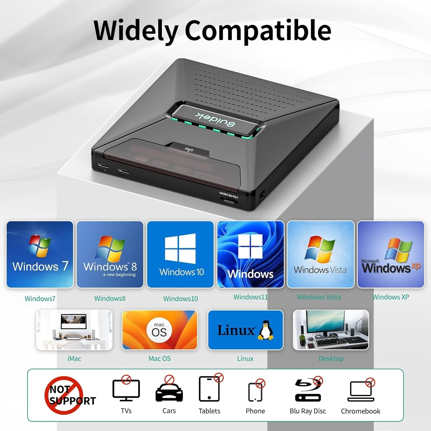 - 7-in-1 Multifunktionalität: CD/DVD-Brenner, 2,5" SATA-Anschluss, 2x USB-A, 1x USB-C, SD/Micro-SD-Kartenleser für vielseitigen Datentransfer und Brennen.
