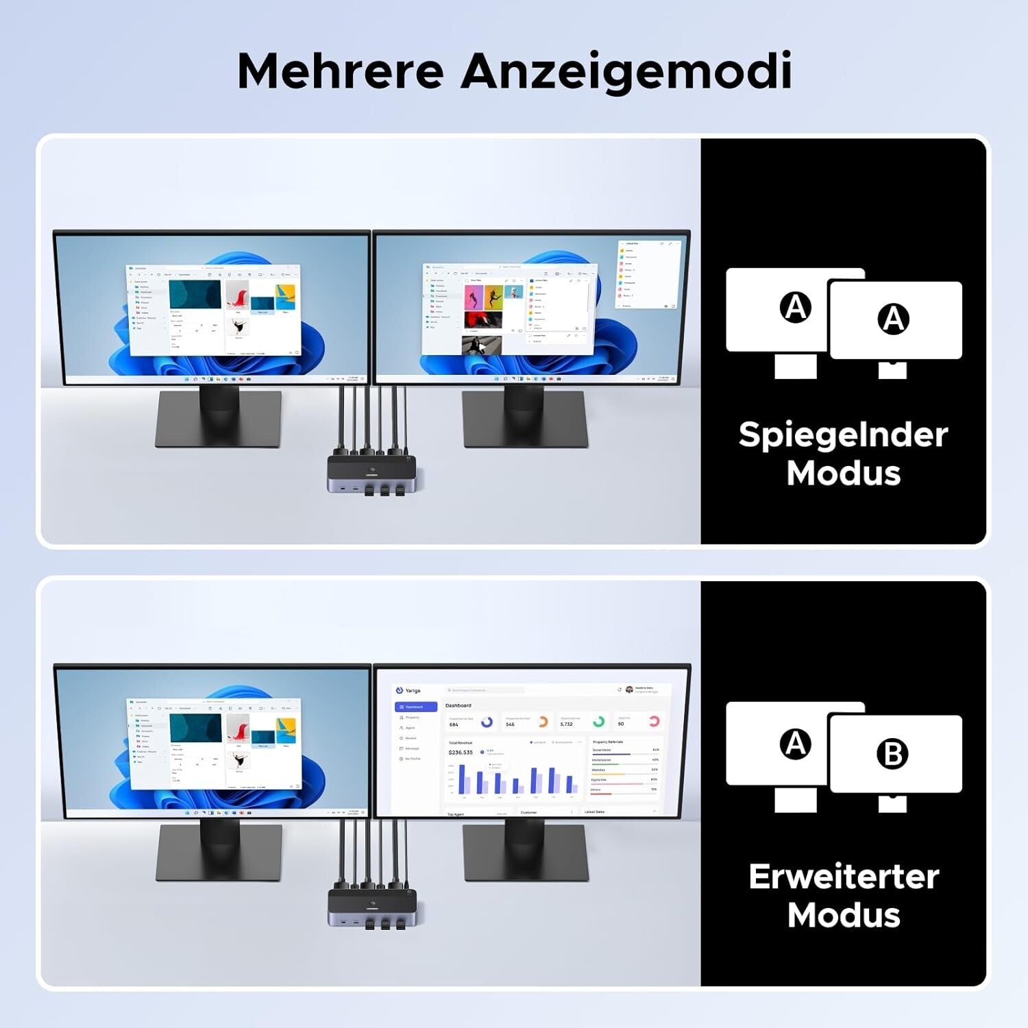 - Dual-Monitor Umschaltung: Zwei PCs teilen zwei DisplayPort-Monitore (Kopiermodus/Erweiterter Modus), mit präziser Kanalzuordnung (DP A/B) für effizientes Multitasking.