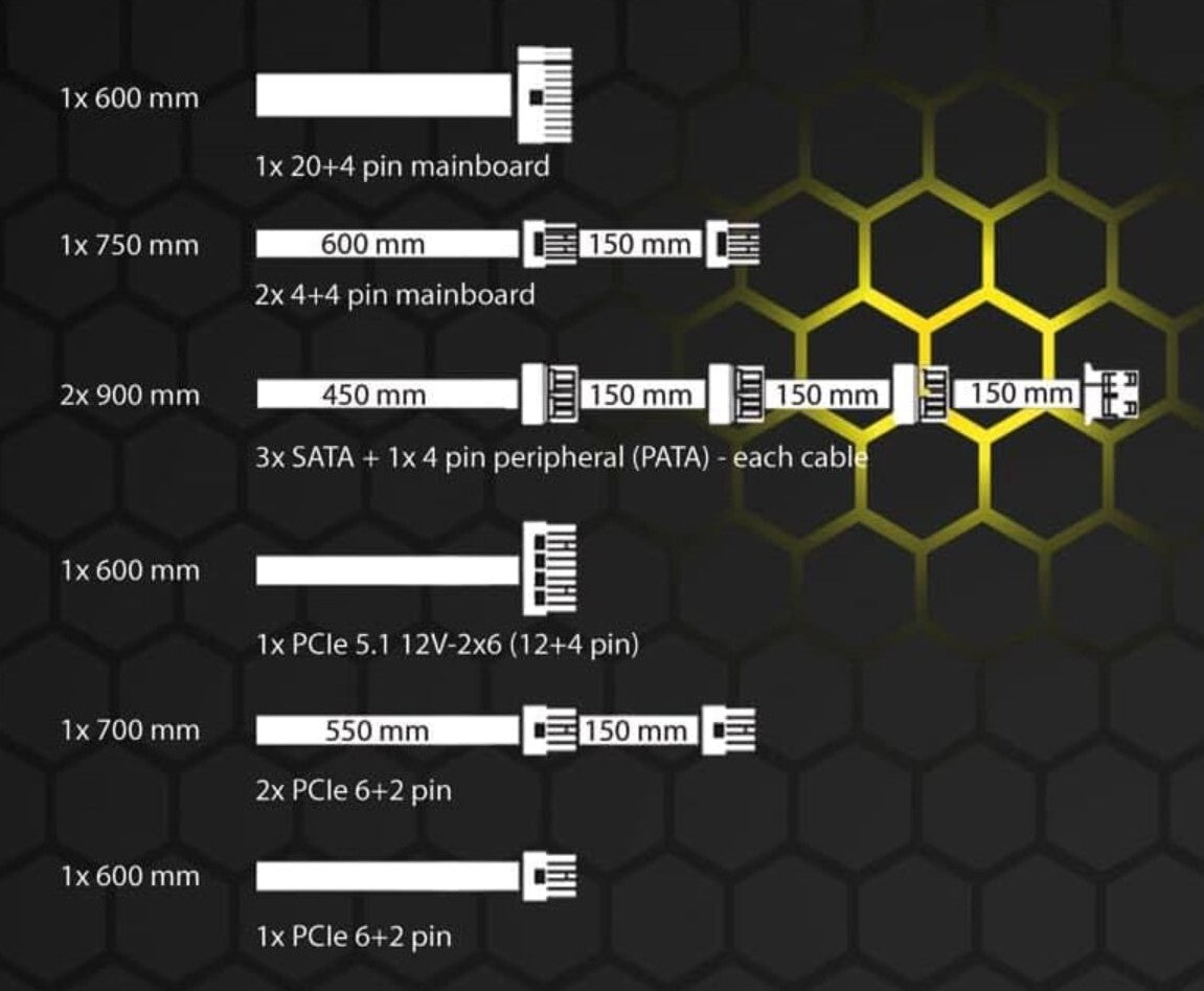 - Vollmodulare Kabel (20+4-Pin, 4+4-Pin, PCIe, SATA, PATA)