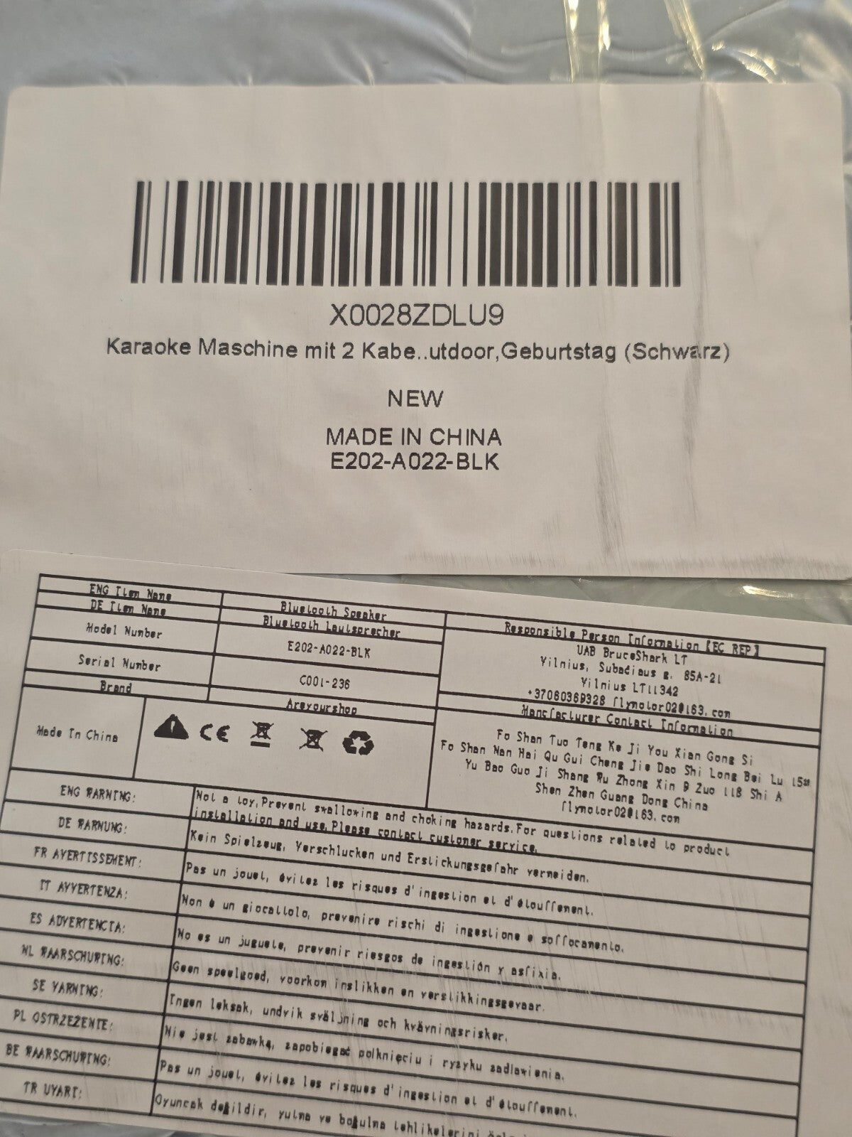 - Lieferumfang: Karaoke Maschine, 2x kabellose Mikrofone, Stromkabel, Bedienungsanleitung